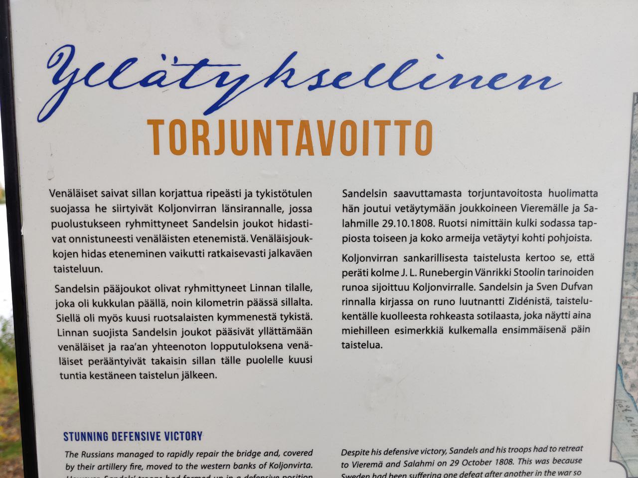 Polun varrella oli tauluja, joissa kerrottiin Koljonvirran taistelusta, joka käytiin Ruotsin ja Venäjän välillä vuonna 1808. Tuossa taistelussa Ruotsi sai torjuntavoitton, mutta koko sotahan sitten olikin Ruotsille tappiollinen ja Suomi liitettiin Venäjän Keisarikuntaan autonomisena osana vuonna 1809.
