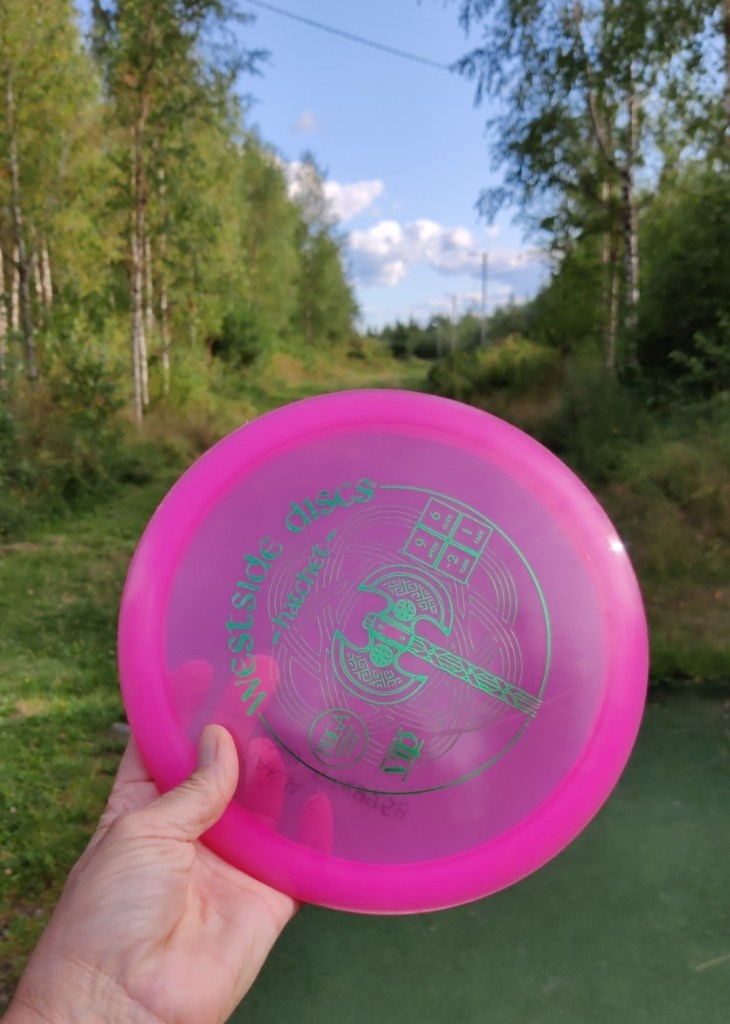 Heinäkuun alussa kävin pyöräilemässä ja satuin ajelemaan Köykärinmäelle. Ehdotin miehelleni, että kävisimme kokeilemassa rataa nyt, kun meillä on ne punkkirokotteet. Tuumasta toimeen. Ensimmäisellä yrityskerralla siellä vain oli maastopyöräilykisat, emmekä halunneet aiheuttaa vahinkoa nuorille pyöräilijöille lennättämällä kiekkoja samaan aikaan. Palasimme seuraavana päivänä. Kiersimme koko radan. Kiekot olivat edelleen surkeita: lensivät vain muutaman metrin ja usein aivan väärään suuntaan. Se ei meitä haitannut, tuloksen parantaminen olisi helppoa! Ensimmäisellä reissulla hukkasin heti kolmannella väylällä ihanan ja parhaiten lentäneen pinkin kiekkoni. Näin mihin se lensi, mutten vaan puolen tunnin hakemisesta huolimatta löytänyt sitä enää!