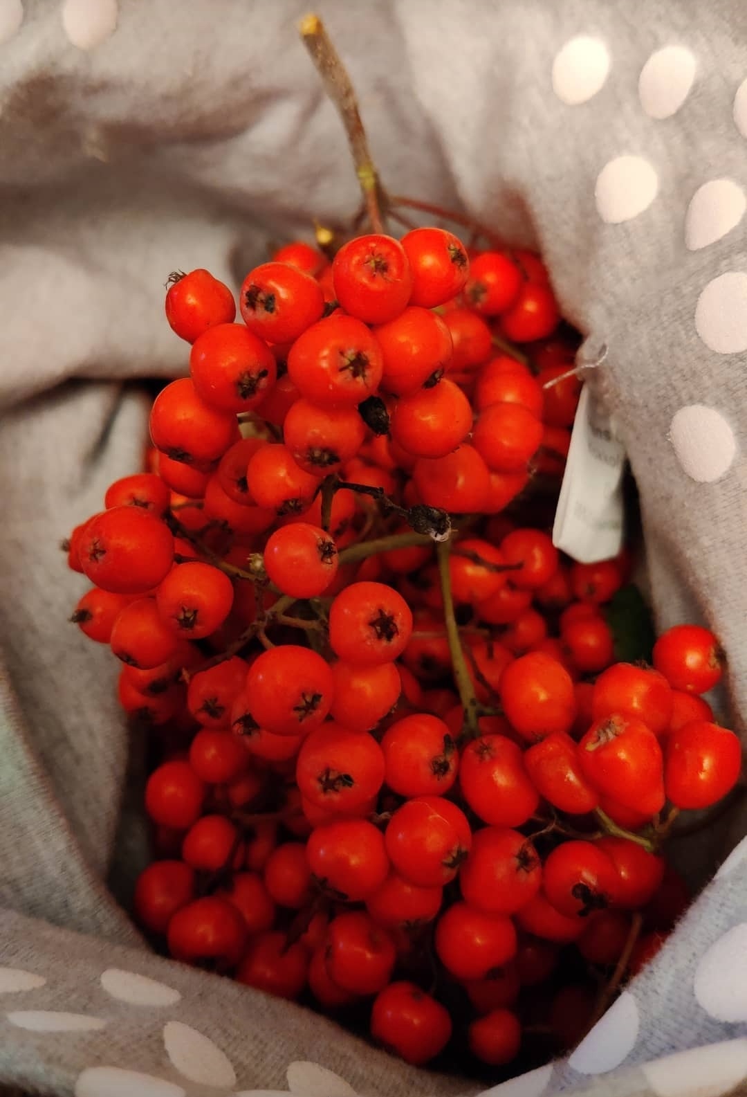 Autolla tuumin, että haluaisin vielä niitä pihlajanmarjojakin. Eräs vanha rouva oli kertonut minulle, kuinka ennen tehtiin ”köyhän miehen lakkahilloa” pihlajanmarjoista ja porkkanoista. Haluisin kovasti kokeilla miltä se maistuu. Ajatukseni oli tehdä vain hyvin pieni kokeiluerä, että saisi maistaa tuota pula-ajan herkkua. Mieheni käski suunnata kohti merenrantaa, siellä on paljon pihlajia. Olihan niitä, mutta aika paljon olivat linnut marjoista jo kalunneet. Saimme kuitenkin sen verran, että pääsisin kokeilemaan vinkattua reseptiä. Koska muovipussi oli tullut käytettyä sienien keruuseen, poimittiin pihlajanmarjat mun pipoon.