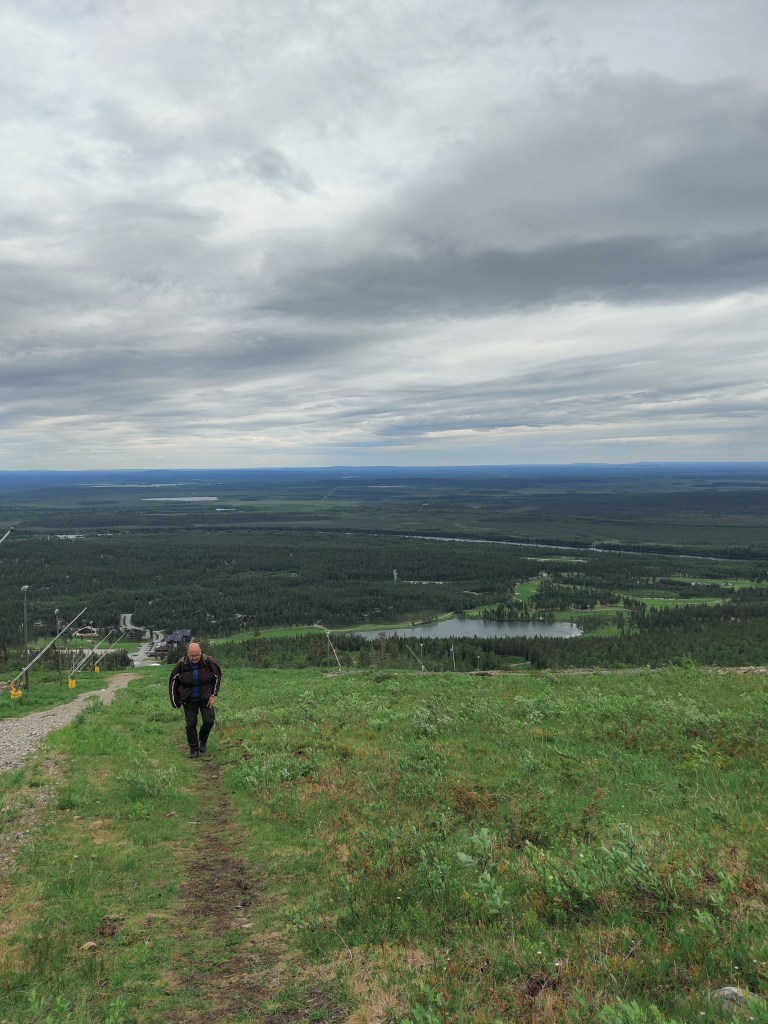 Mukavasti meni 4 tuntia tunturissa. Meillä oli mukana pienet eväät, joita me söimme matkan varrella olevalla kodalla. Kodan kohdalla pisti silmään, että Levillä on alettu kehittää kesämatkailua entisestään. Maastopyöräreittejä oli jo viimeksi muutama. Välivuoden aikana (Levinlomissamme on ollut vuoden tauko!) niitä oli tullut lisää. Uutena asiana oli frisbeegolf-rata, joka on vielä rakenteilla. Koreja kuitenkin oli jo laitettu. Pari nuorta oli jo kokeilemassa heittotaitojaan vaikka lähtölavat vielä puuttuivat.
